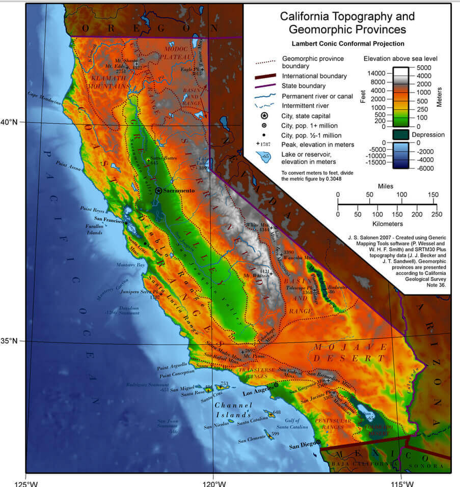 In the middle of the state lies the California Central Valley, bounded by the coastal mountain ranges in the west, the Sierra Nevada to the east, the Cascade Range in the north and the Tehachapi Mountains in the south. The Central Valley is California's agricultural heartland.
