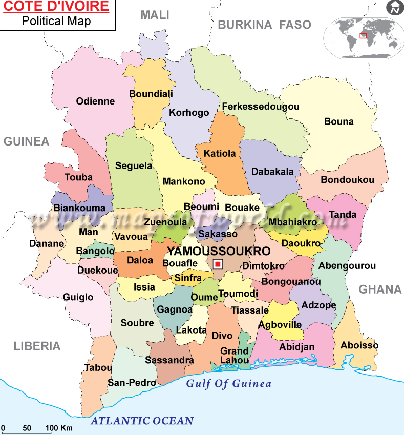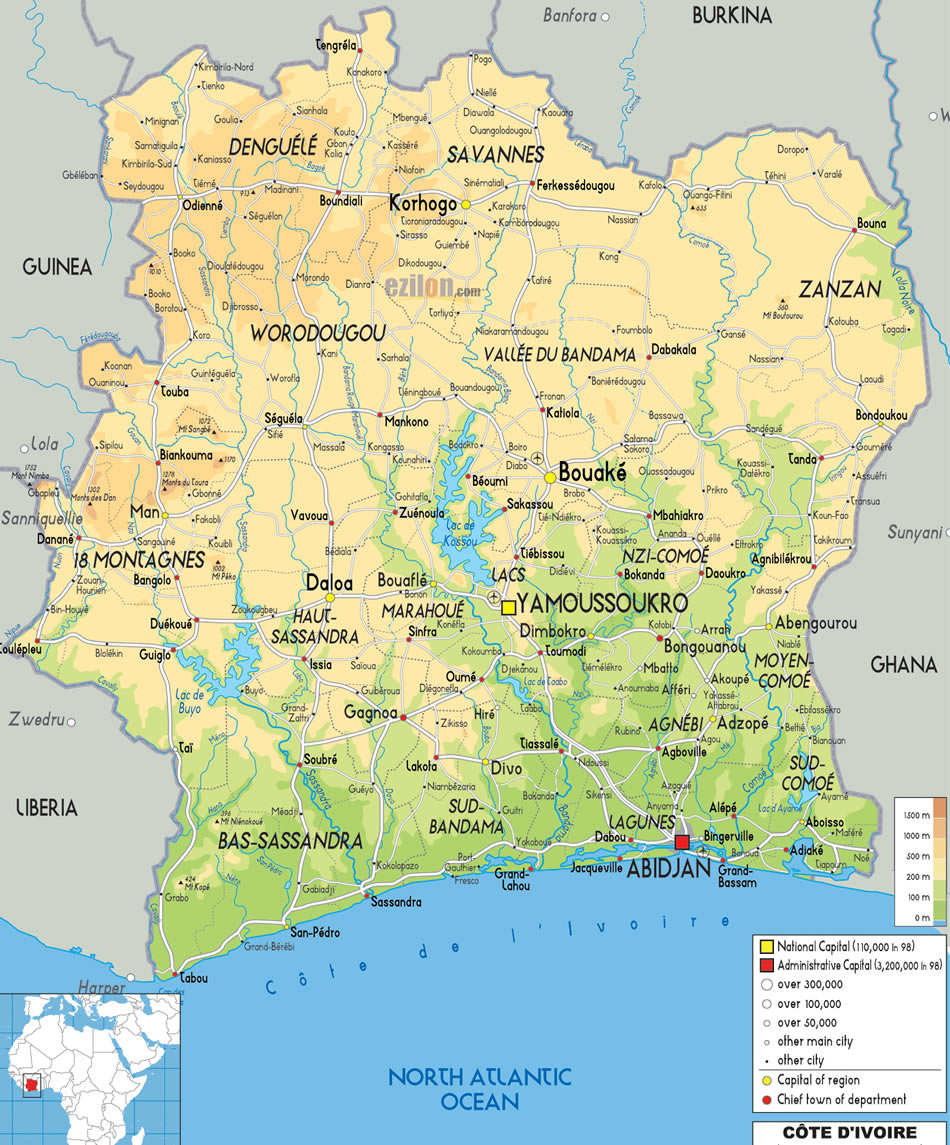 Cote d'Ivoire has a population of 20,617,068 people, Cote d'Ivoire's capital city is Yamoussoukro and largest city Abidjan.