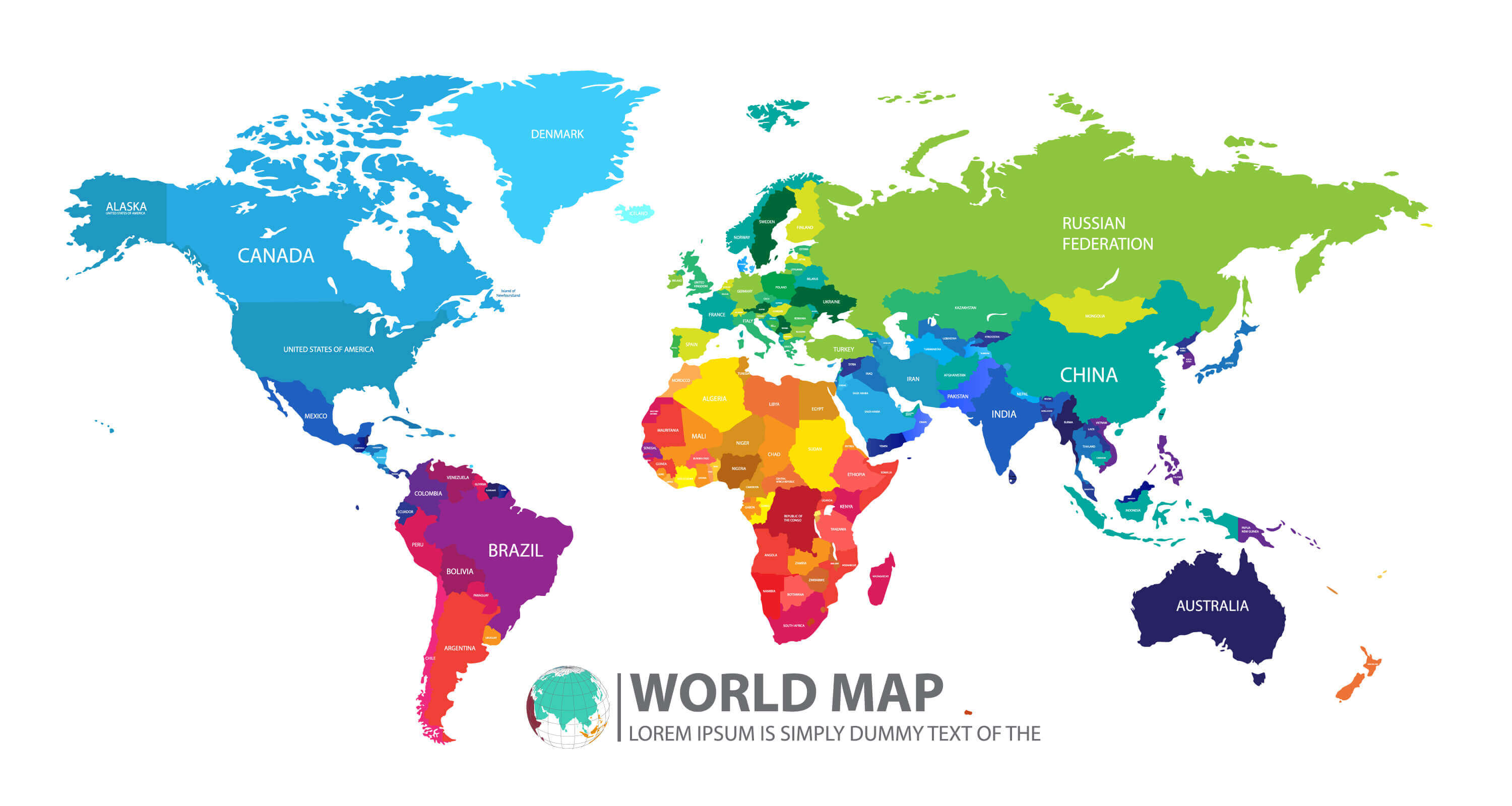 World Map with Globes - detailed editable vector, include all Names of Countries and Capitals of Asia - outline national border lines