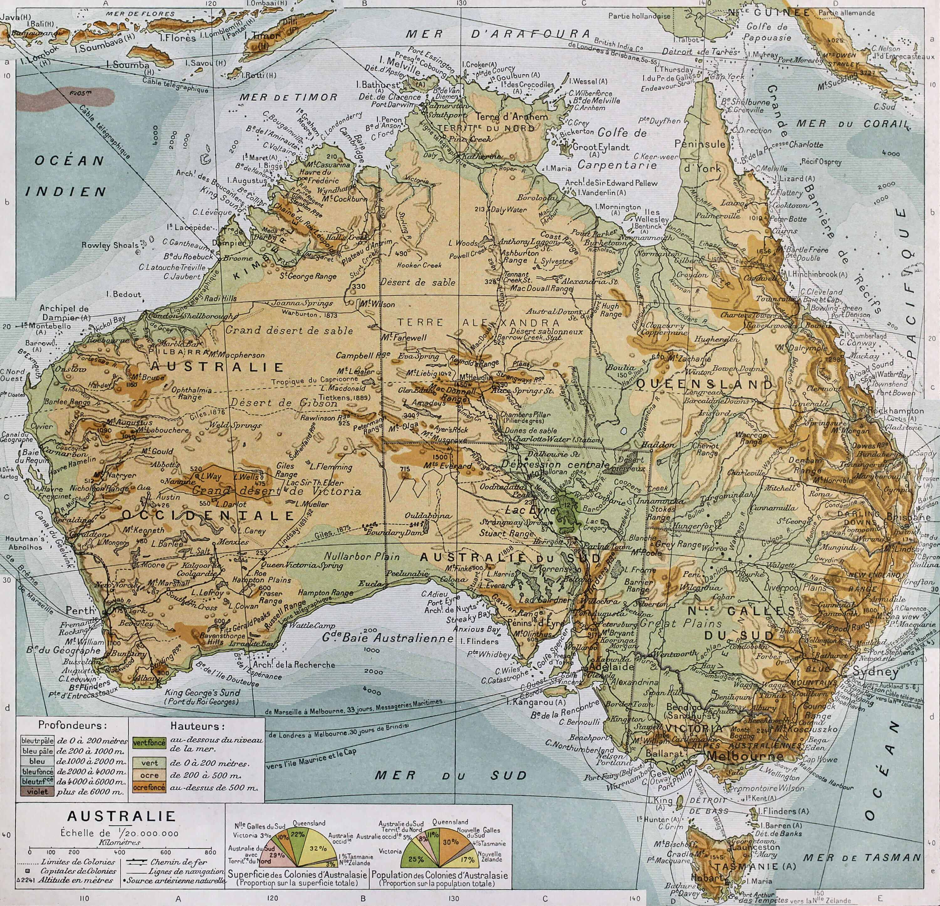 Australia physical map. By Paul Vidal de Lablache, Atlas Classique, Librerie Colin, Paris, 1894 (first edition)