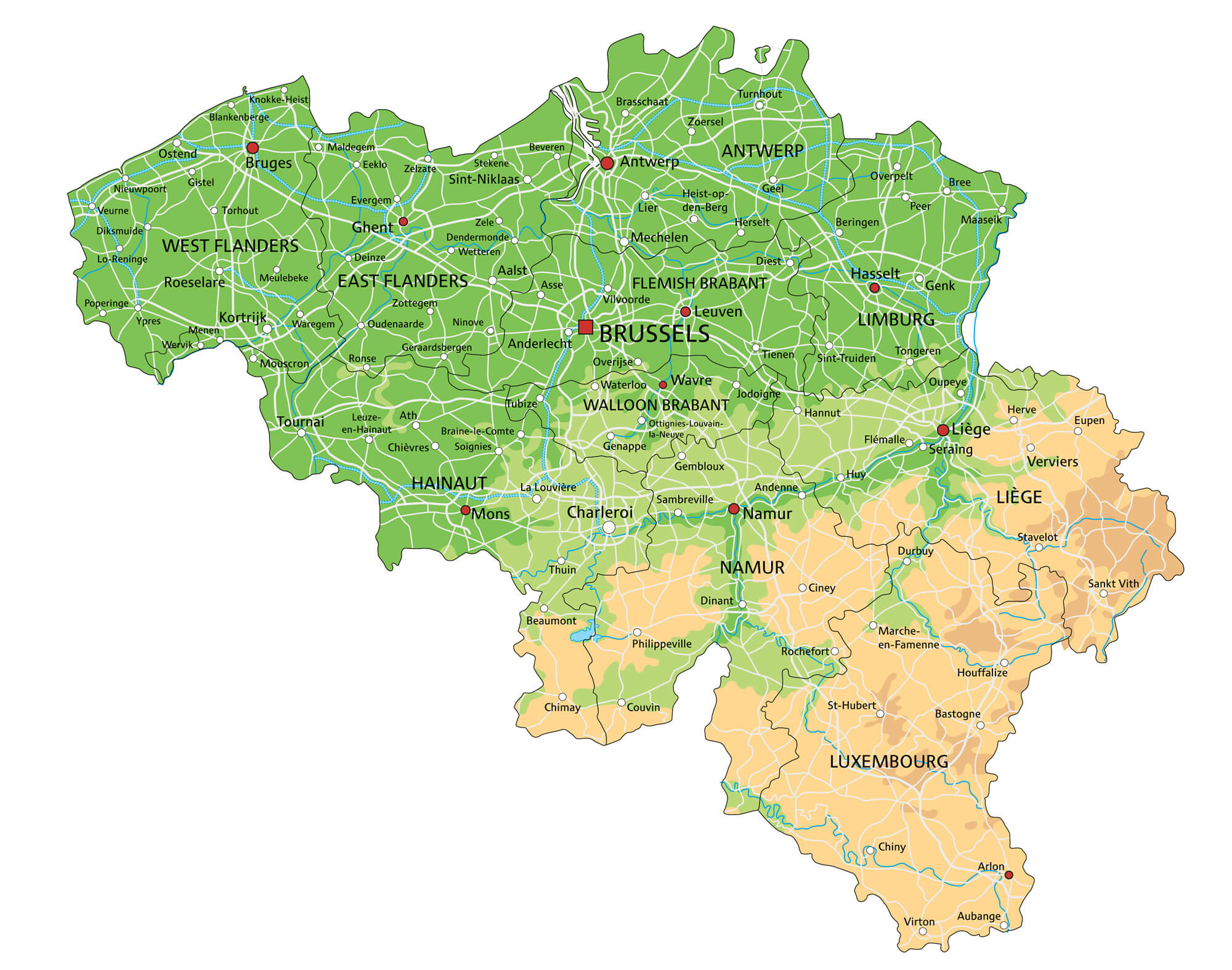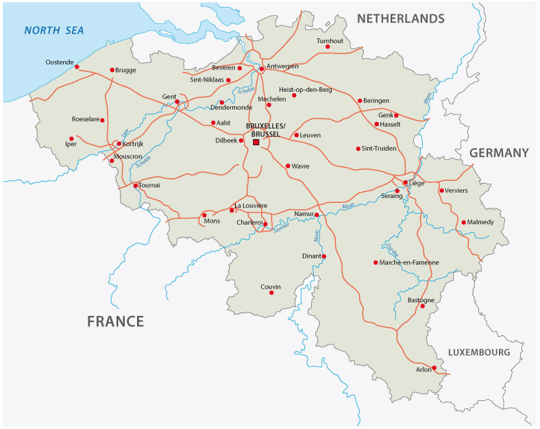 Belgium map with major cities.