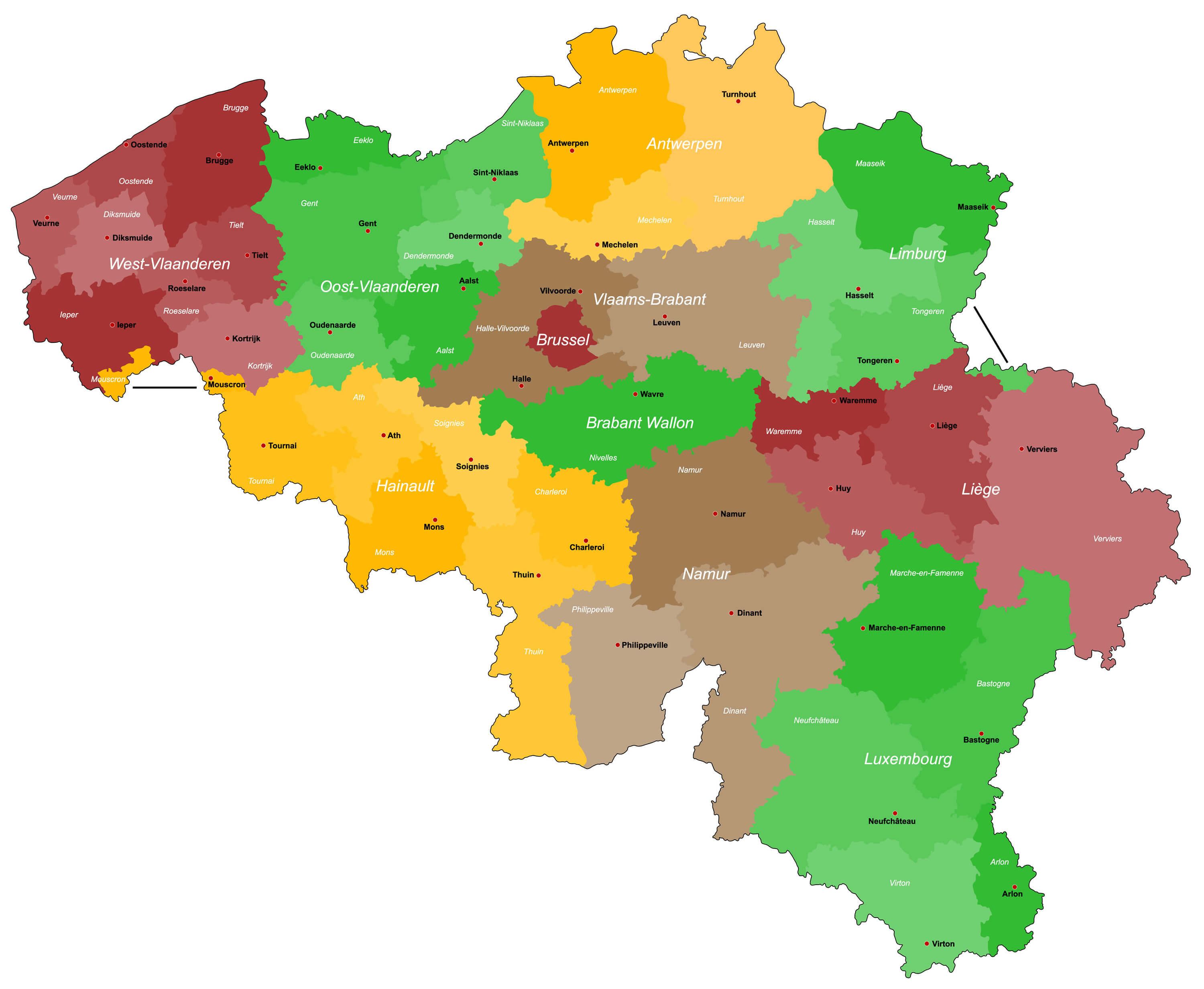 Belgium main cities map with provinces.