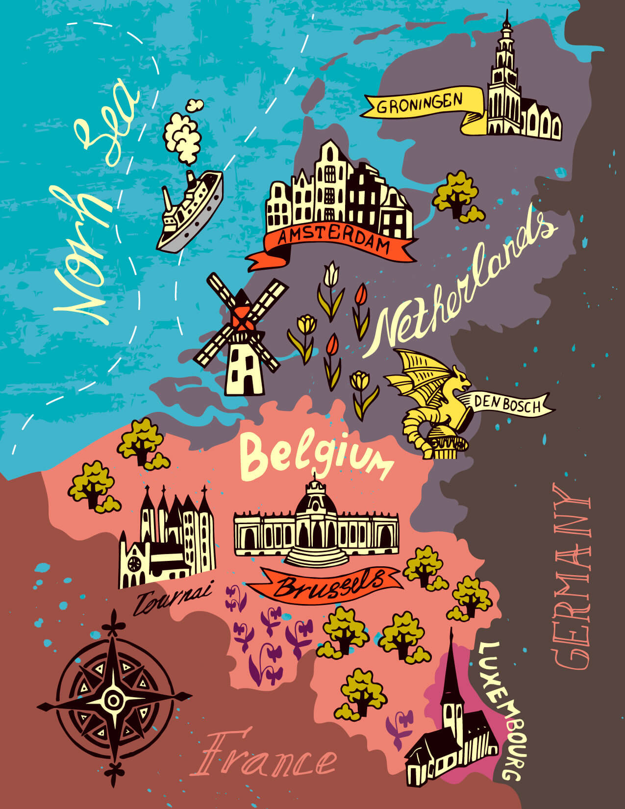 Illustrated map of the Netherlands, Belgium, Luxembourg.