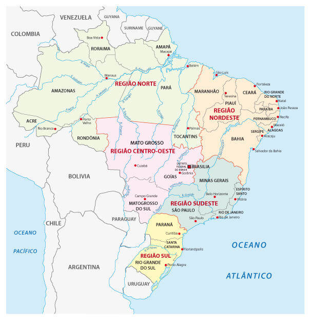 Brazil Regions Map with major cities, regions and states.