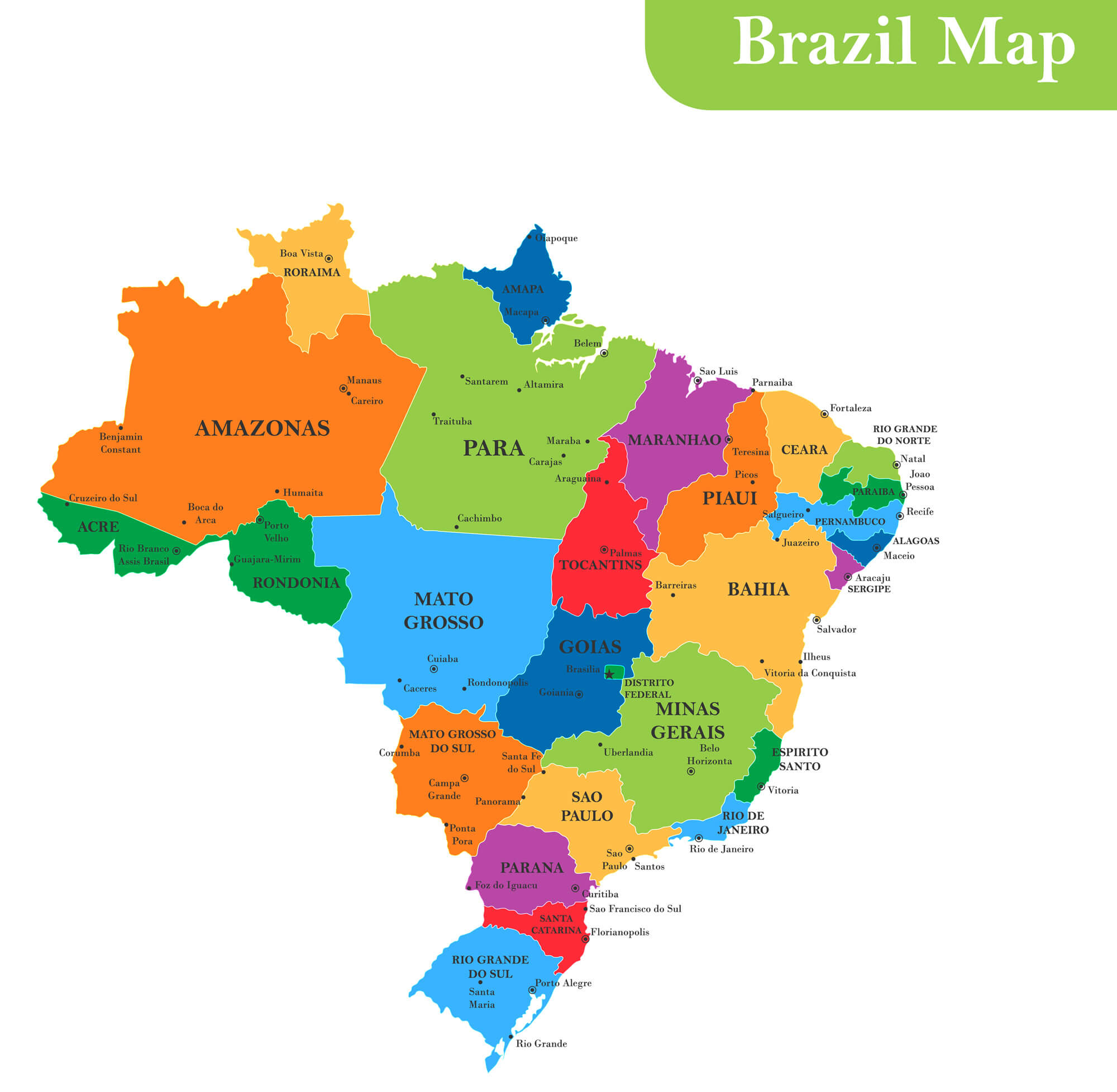 Map of Brazil with all capitals. Cities of Brazil.