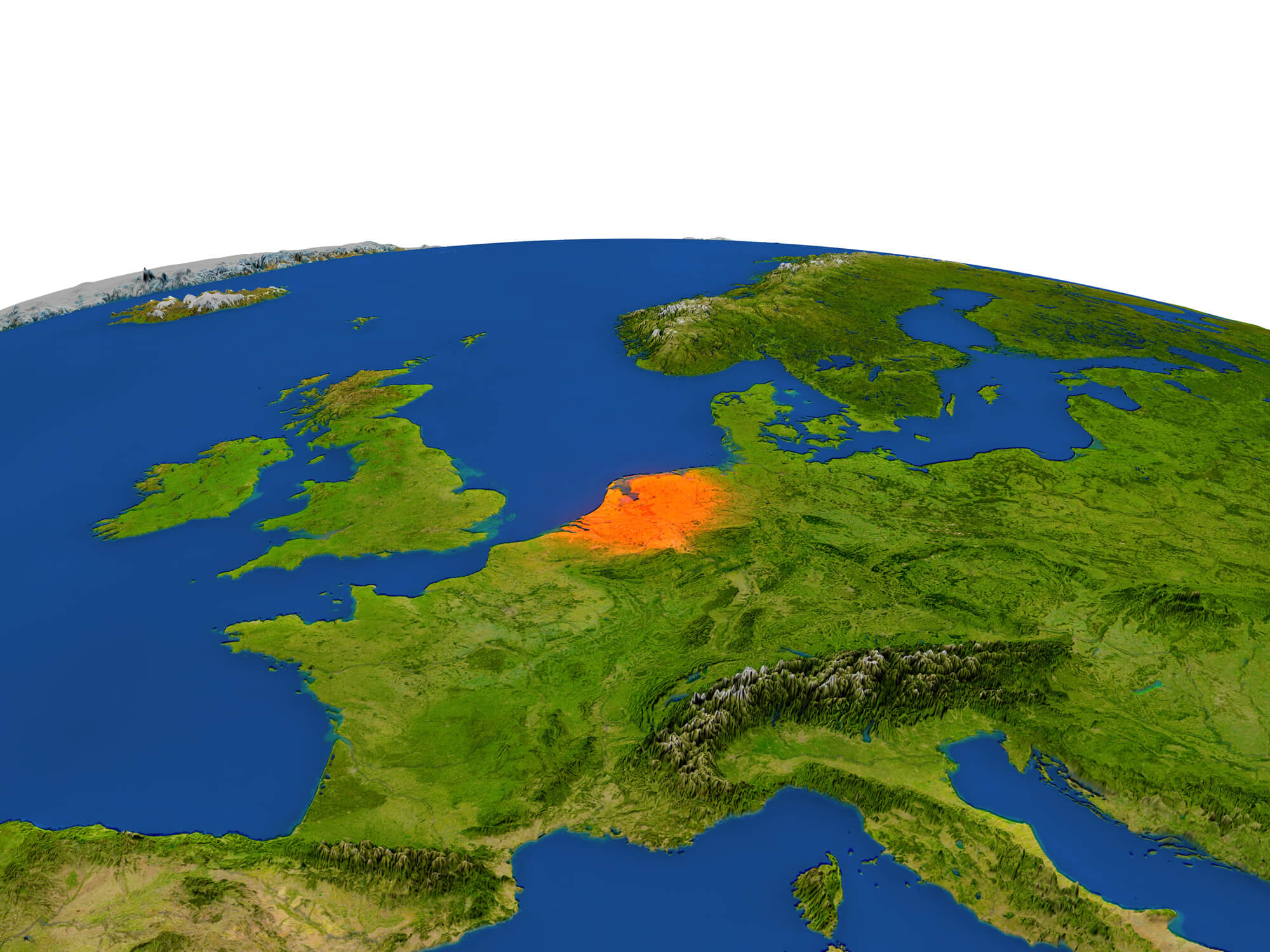 Netherlands from Earth's orbit in space highlighted in red color. 3D illustration with highly detailed realistic planet surface. Elements of this image furnished by NASA.