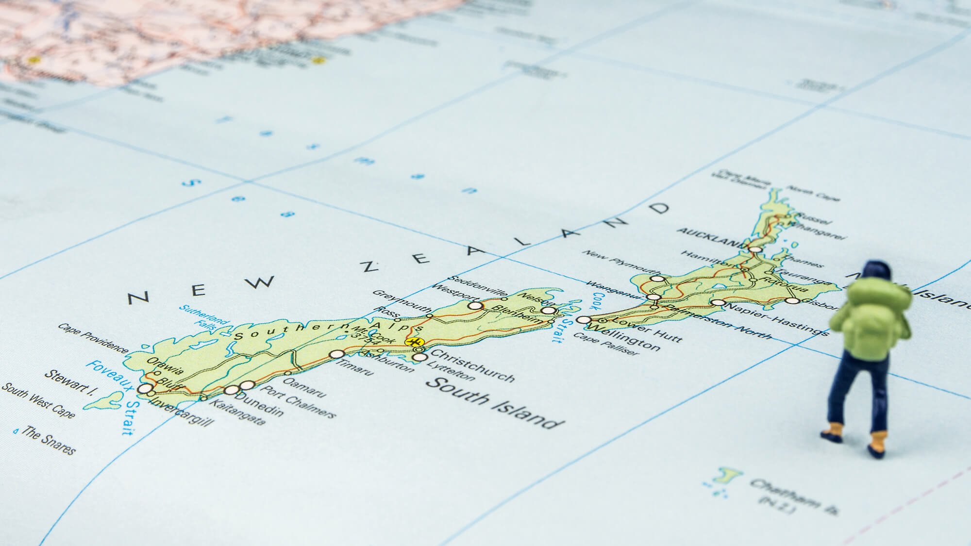 Closeup of miniature figurine of young traveler standing on big map next to New Zealand islands.
