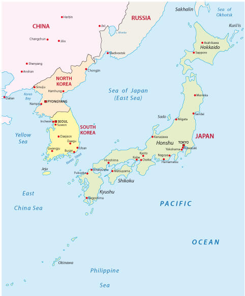 Japan Korea Map with major cities.