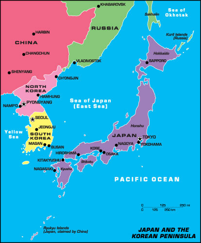Japan and the Korean Peninsula Map, North Korea and South Korea.