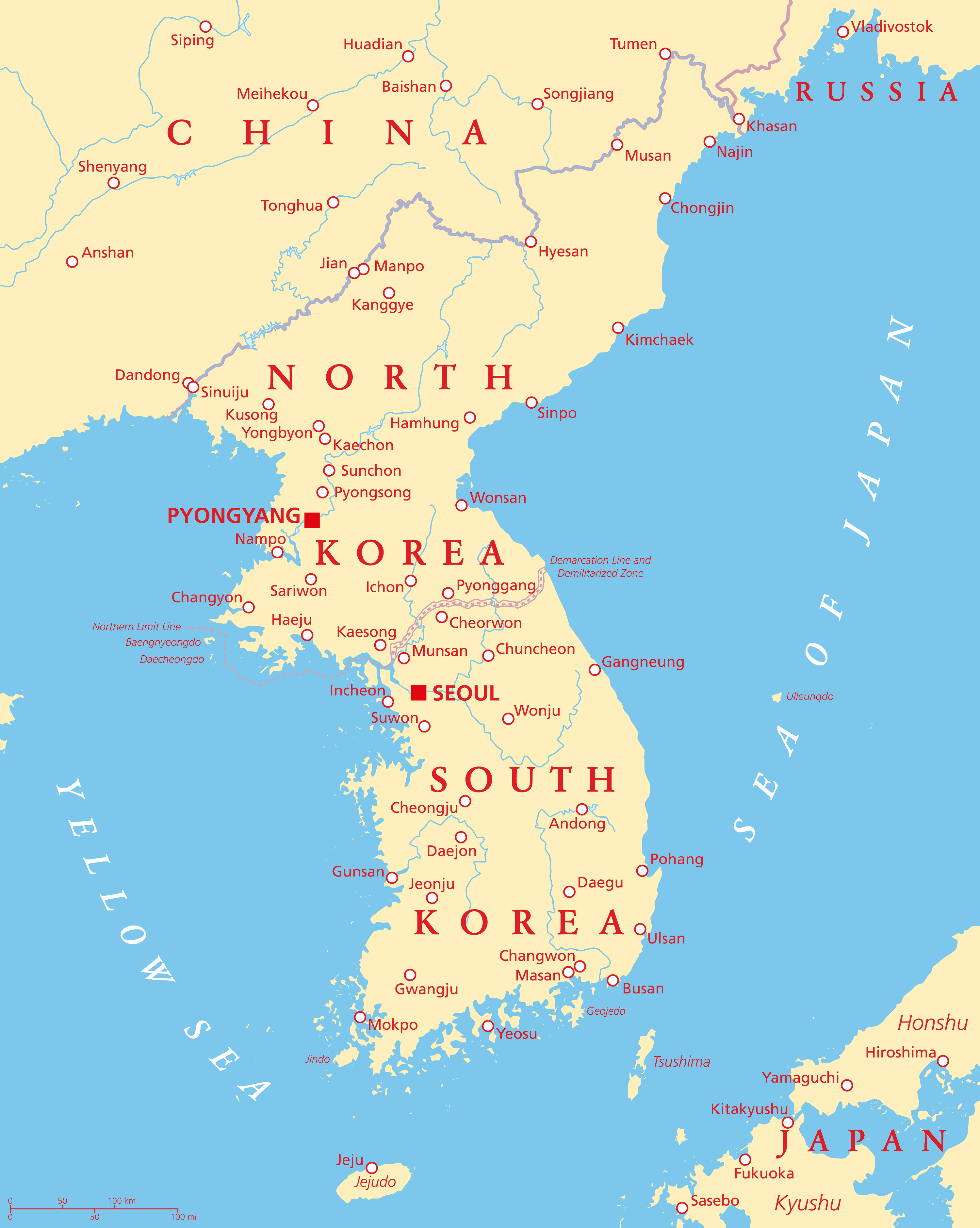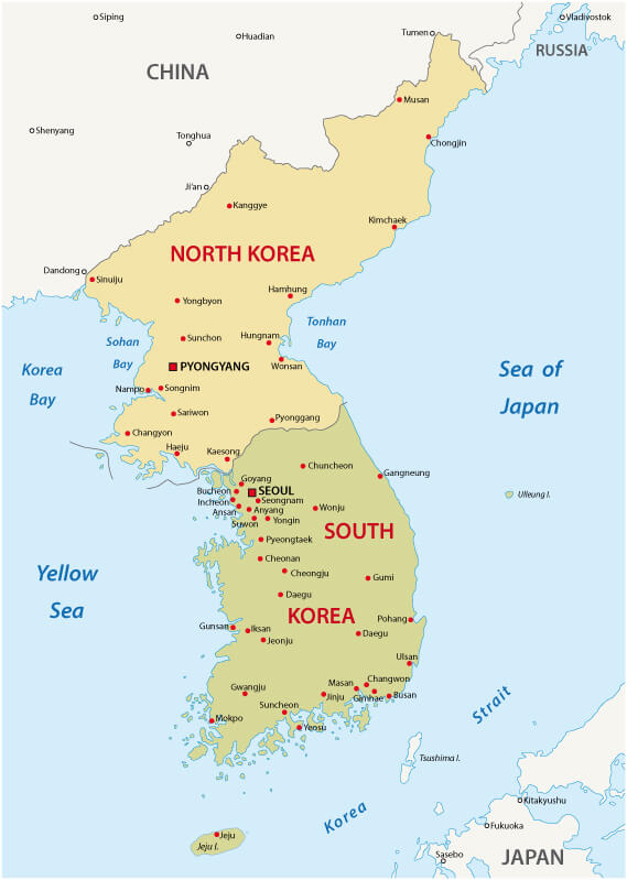 Korean peninsula map, Noth Korea and South Korea major cities.