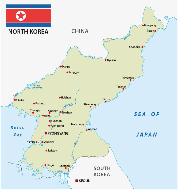 North Korea map with flag capital city of Pyongyang and main cities.