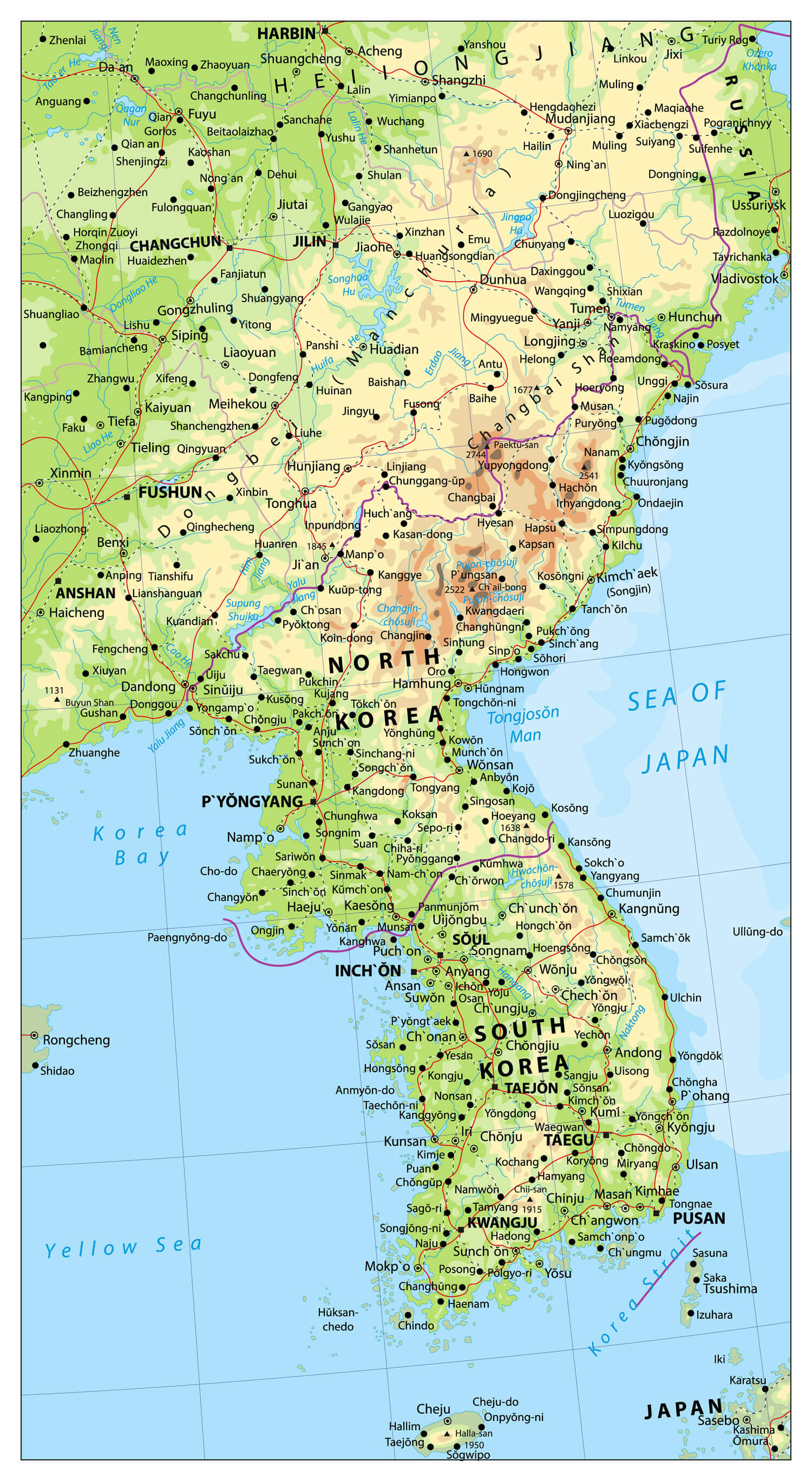 Korean Peninsula large detailed physical map with roads, railroads, water objects, cities and capitals.