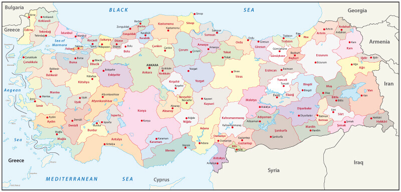 Turkey administrative map with ciites' borders.