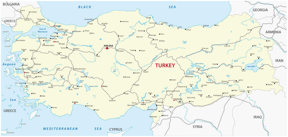 Turkey Road Map with National Borders.
