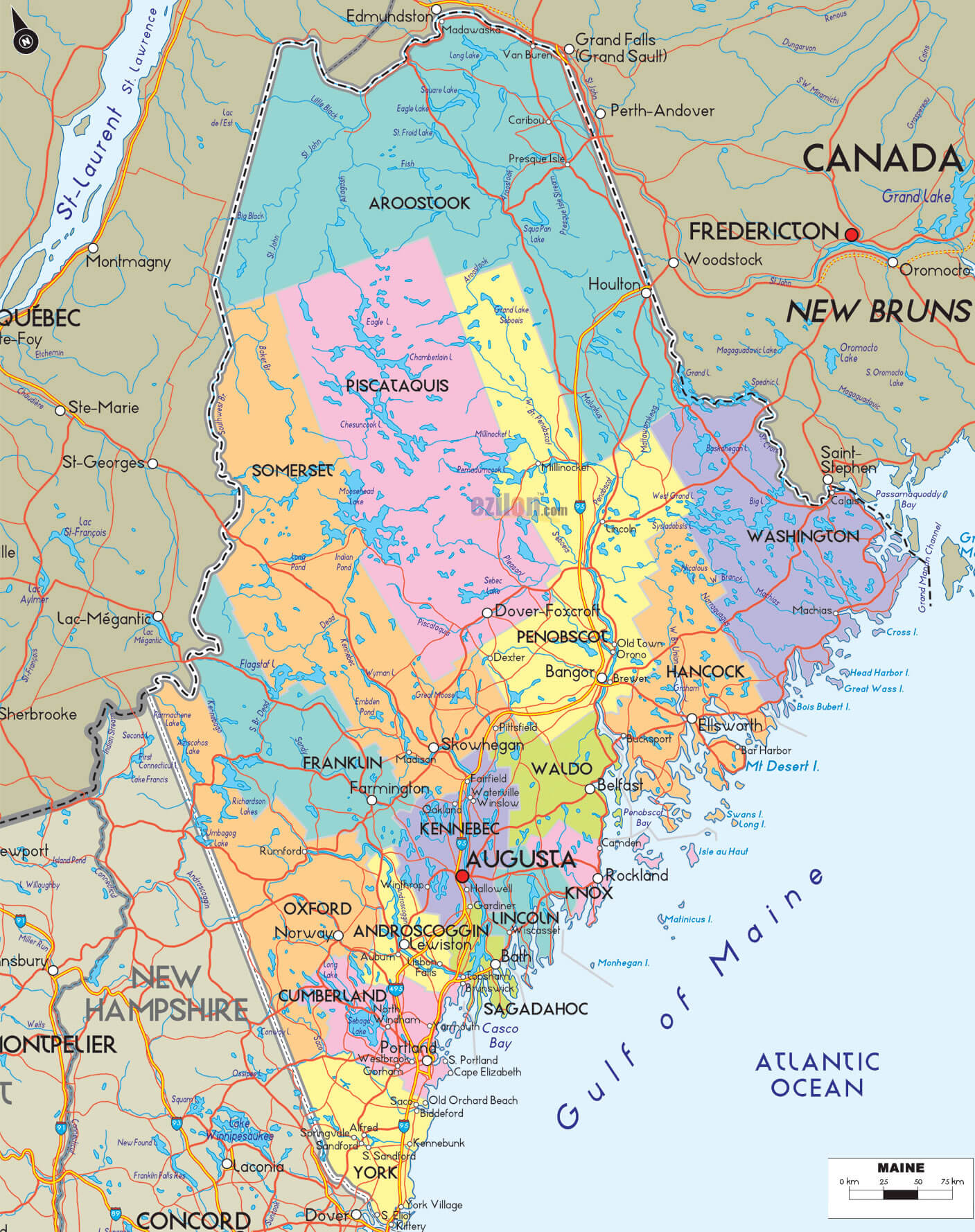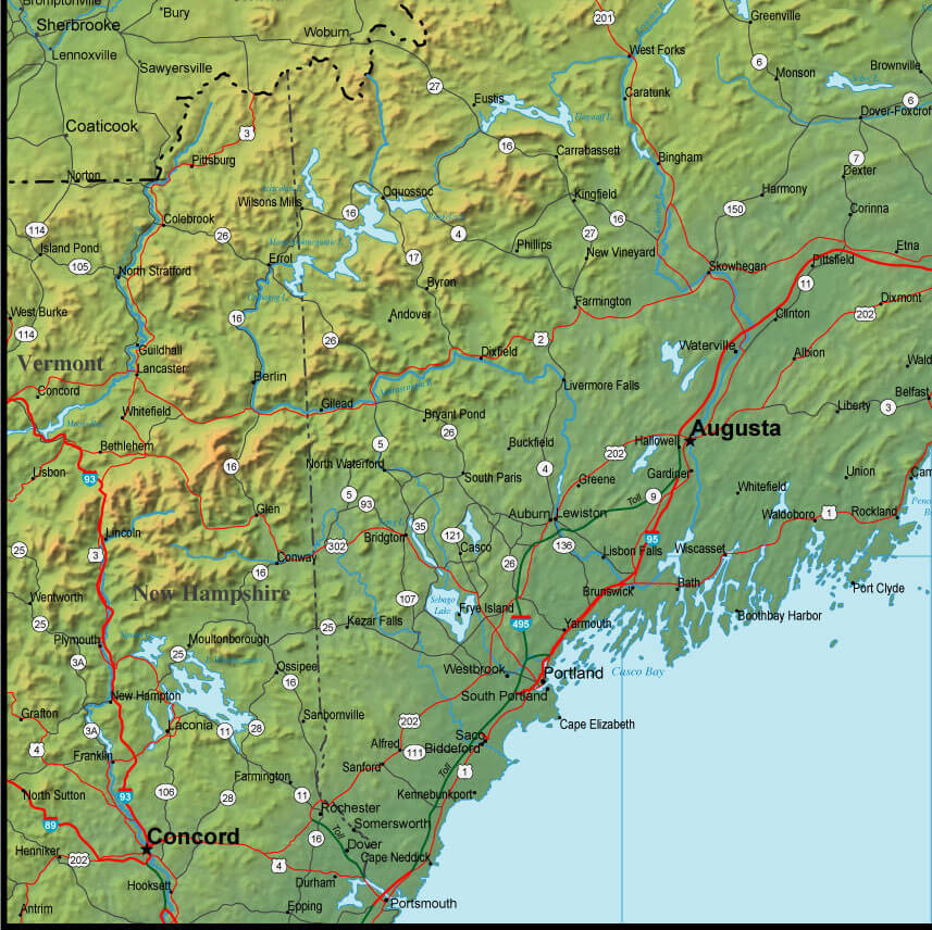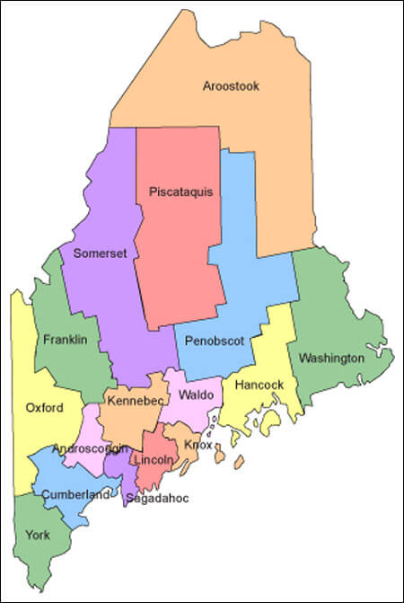Explore the beauty and diversity of the Pine Tree State in detail. Located in the northeastern region of the United States, Maine is known for its picturesque coastline, rich maritime history, and stunning natural scenery. With Maine map, you can discover all of Maine's 16 counties, major cities like Portland, Bangor, and Augusta, and the state's top tourist destinations, including Acadia National Park, Bar Harbor, and Old Orchard Beach.