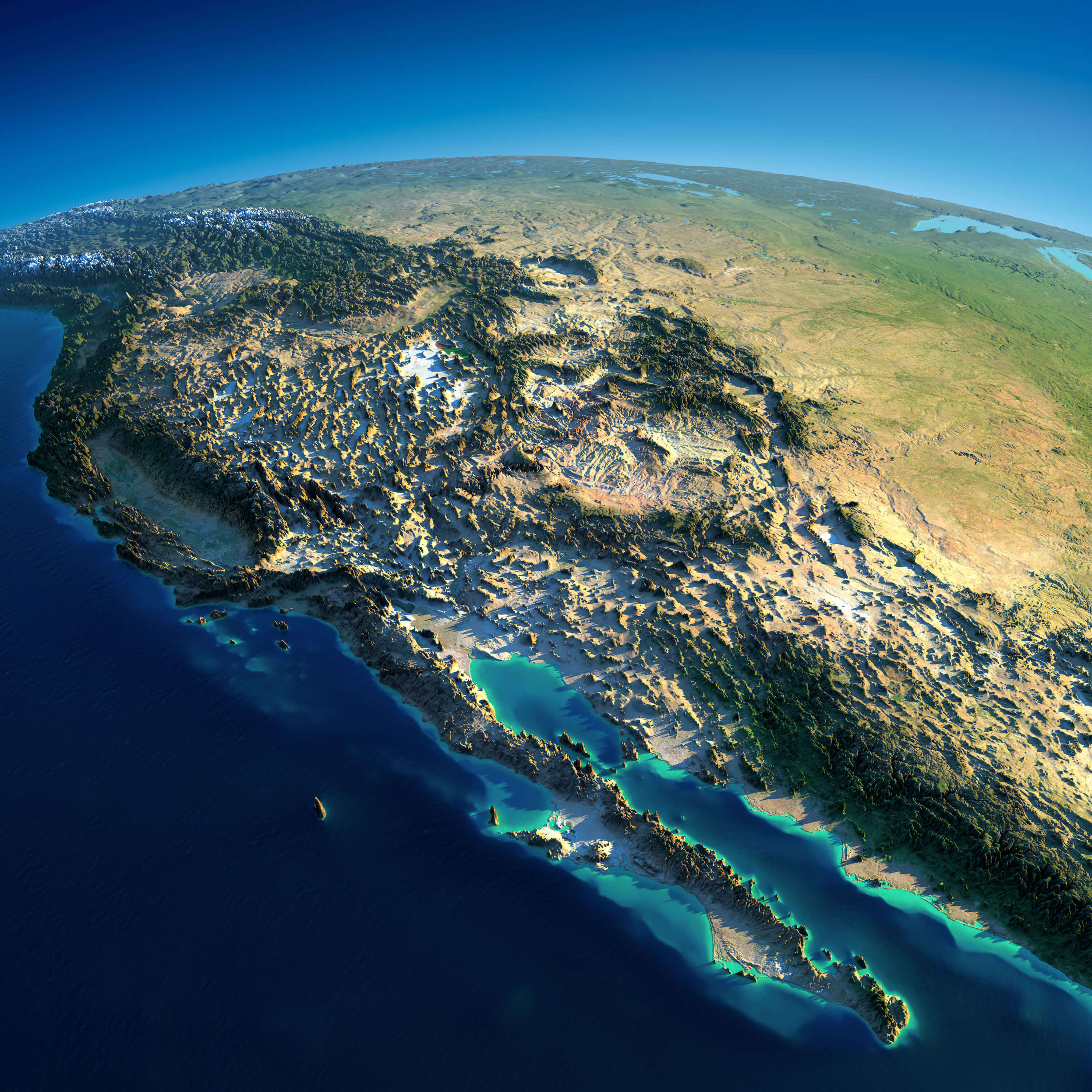 Highly detailed planet Earth. Exaggerated precise relief is illuminated by the rising sun from the east. Gulf of California, Mexico and western U.S. states. Elements of this image furnished by NASA