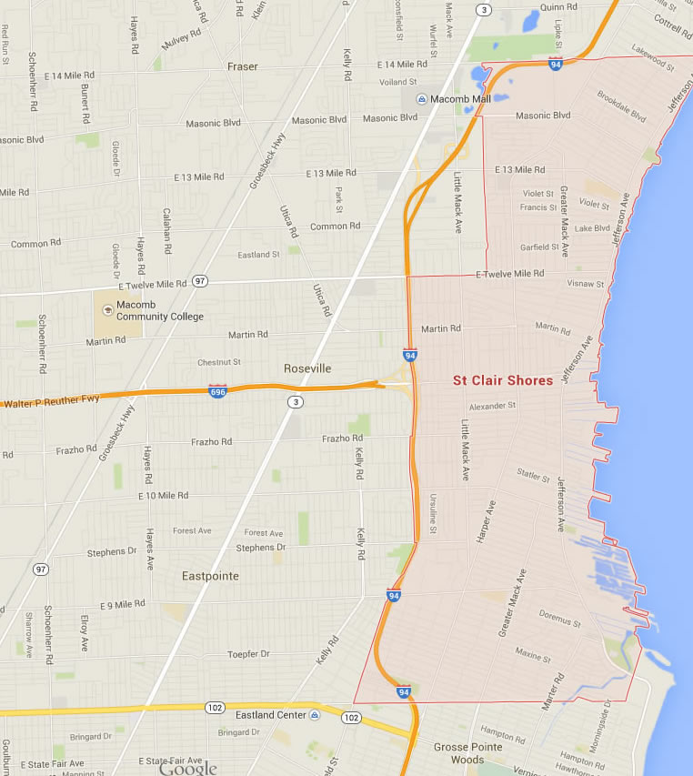Navigate St. Clair Shores, Michigan Map, map of St. Clair Shores, St. Clair Shores Michigan regions map, St. Clair Shores satellite image, towns map, road map of St. Clair Shores.