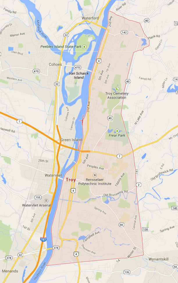 Navigate Troy, New York Map, map of Troy, Troy New York regions map, Troy satellite image, towns map, road map of Troy.