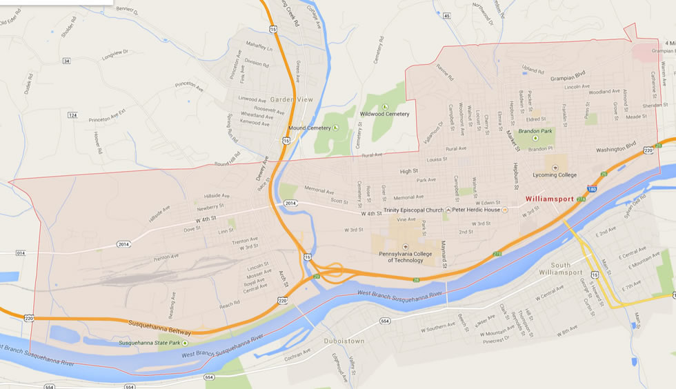 Navigate Williamsport, Pennsylvania Map, map of Williamsport, Williamsport Pennsylvania regions map, Williamsport satellite image, towns map, road map of Williamsport.