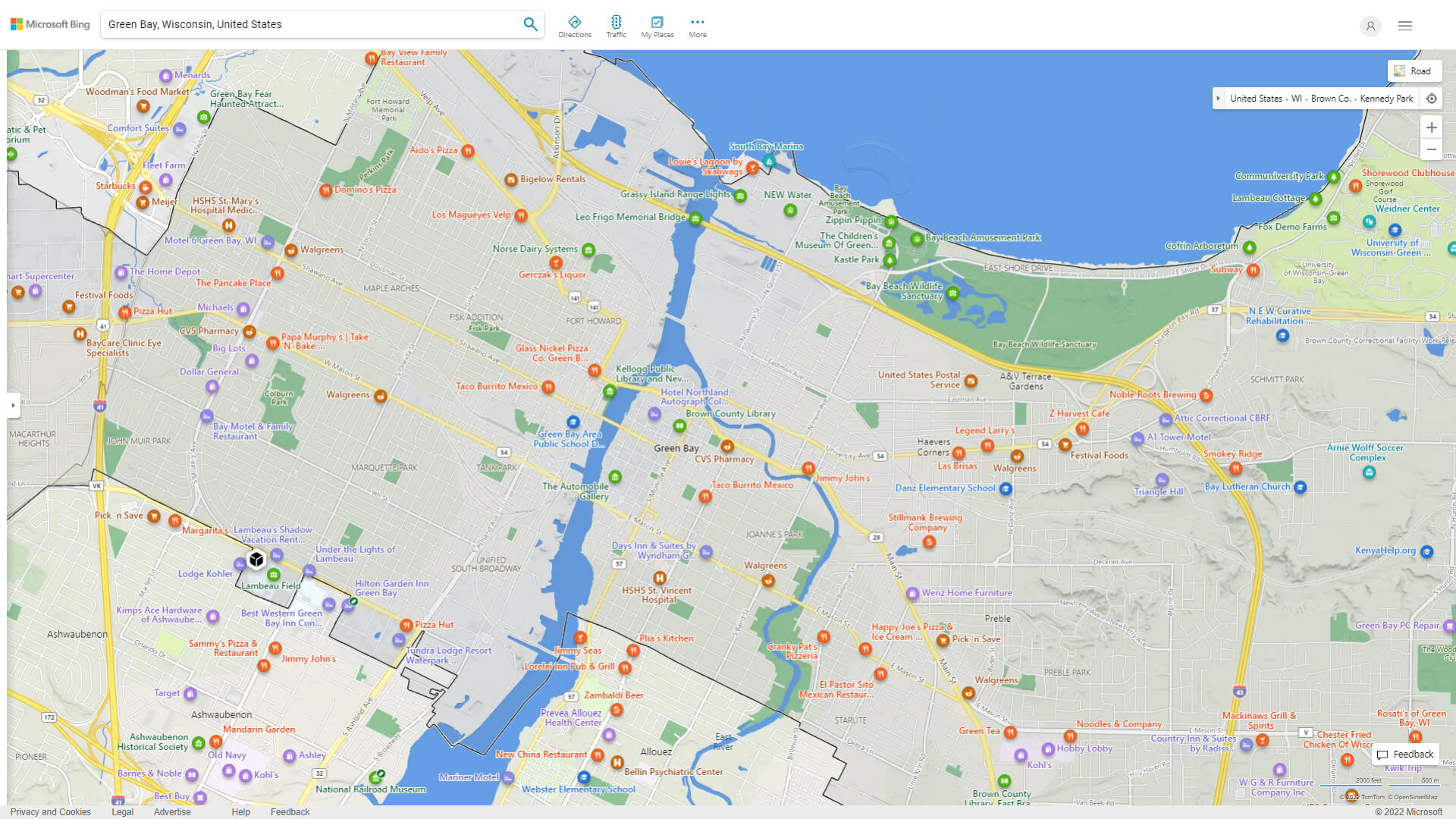 Navigate Green Bay, Wisconsin Map, map of Green Bay, Green Bay Wisconsin regions map, Green Bay satellite image, towns map, road map of Green Bay.