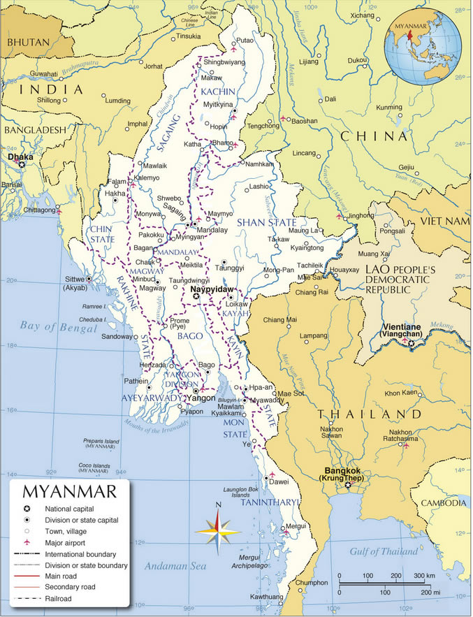 Myanmar has a population of 60,280,000 people, Myanmar's capital city is Naypyidaw and largest city Yangon (Rangoon).