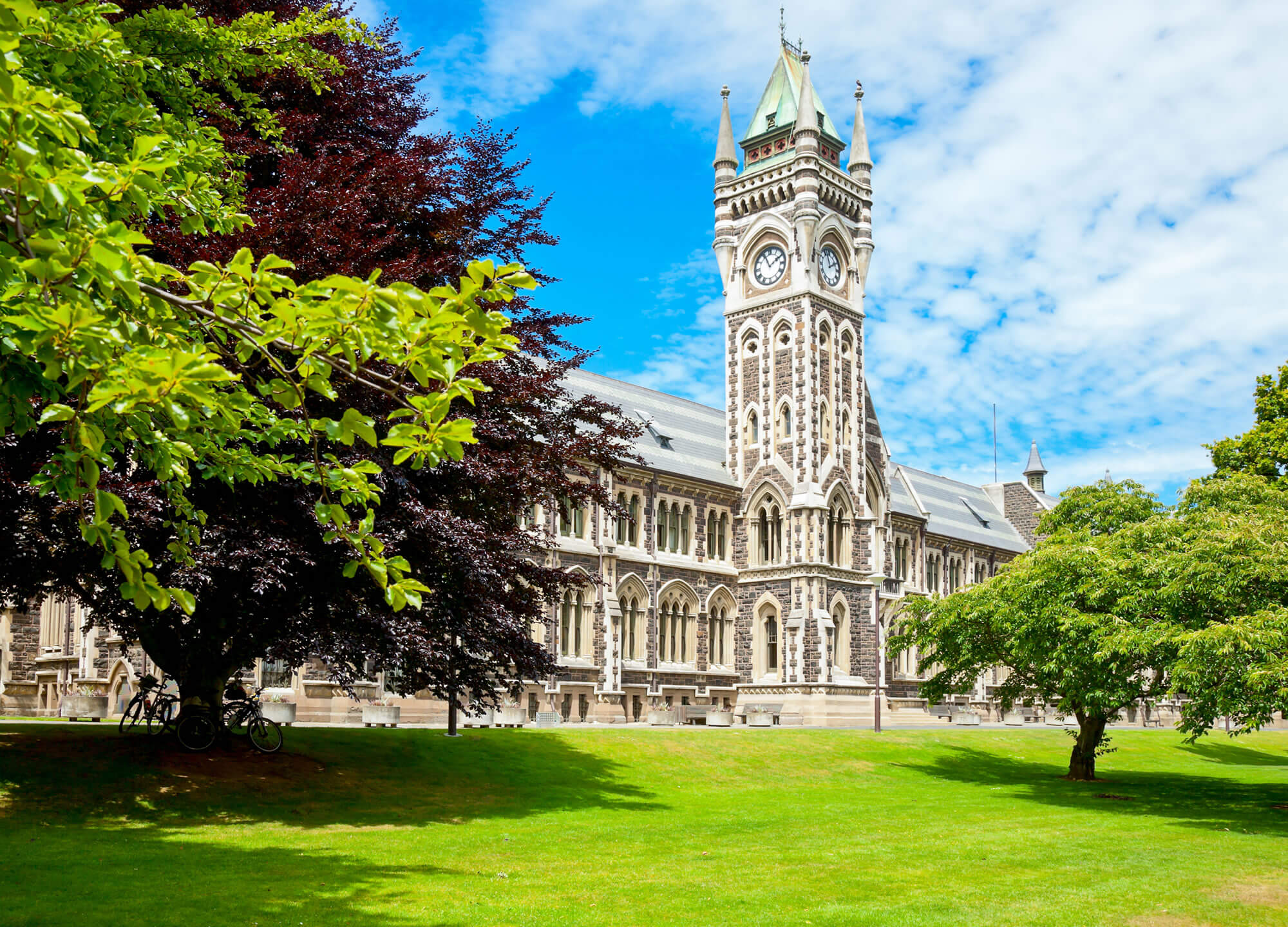 Clocktower of University of Otago Registry Building in Dunedin, New Zealand.