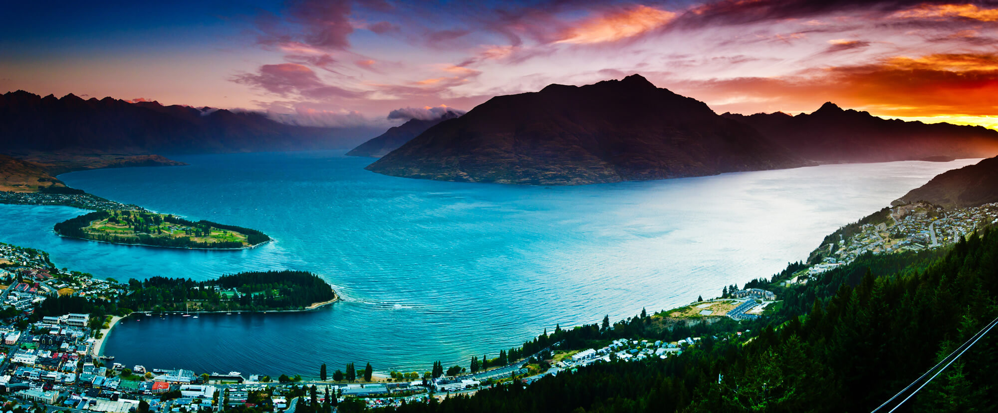 Aerial view of Queenstown with lake Wakatipu at Dusk in panorama.
