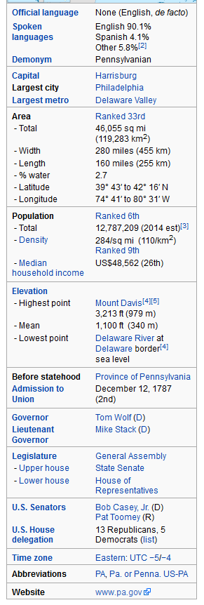 Pennsylvania, officially the Commonwealth of Pennsylvania, is a U.S. state that is located in the Northeastern and Mid-Atlantic regions of the United States, and the Great Lakes region. The state borders Delaware to the southeast, Maryland to the south, West Virginia to the southwest, Ohio to the west, Lake Erie and Ontario, Canada to the northwest, New York to the north and New Jersey to the east. The Appalachian Mountains run through the middle of the state.