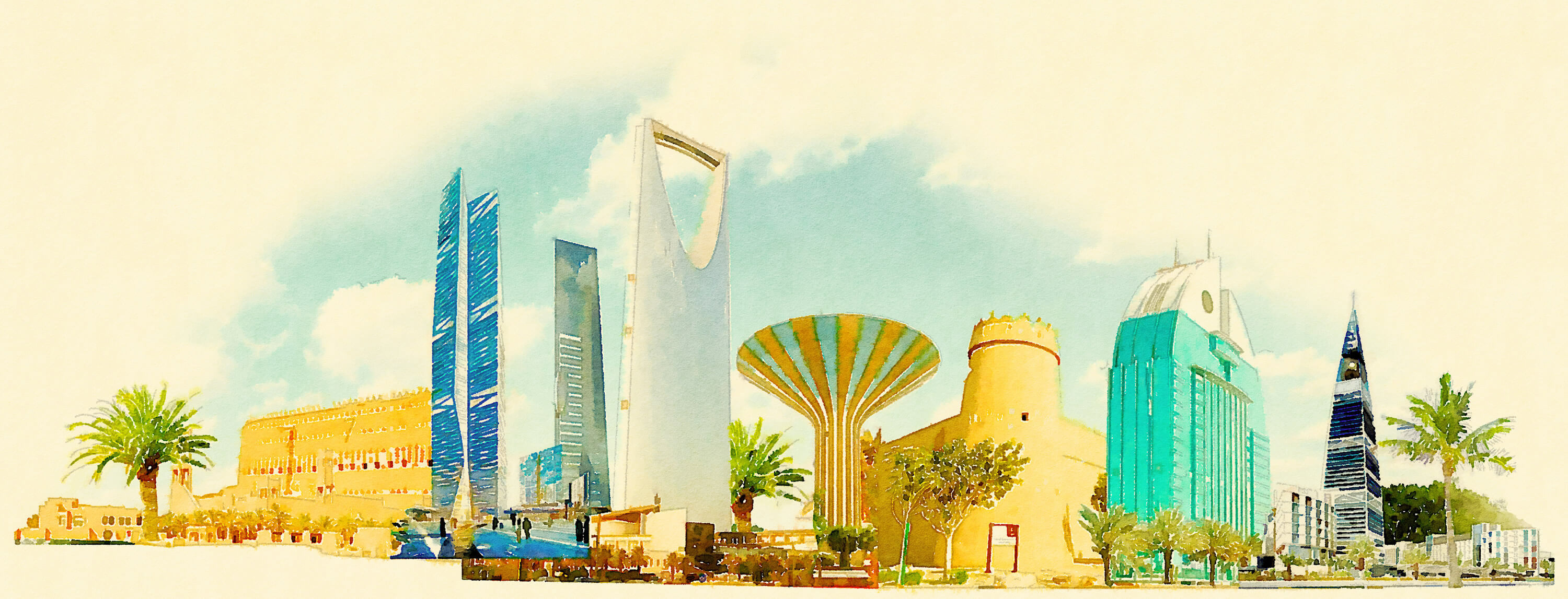 RIYADH, SAUDI ARABIA - OCTOBER 15, 2015: Outside distance skyline view on Riyadh Kingdom tower, Al Faisaliah and other business skyscrapers, full wide panorama.