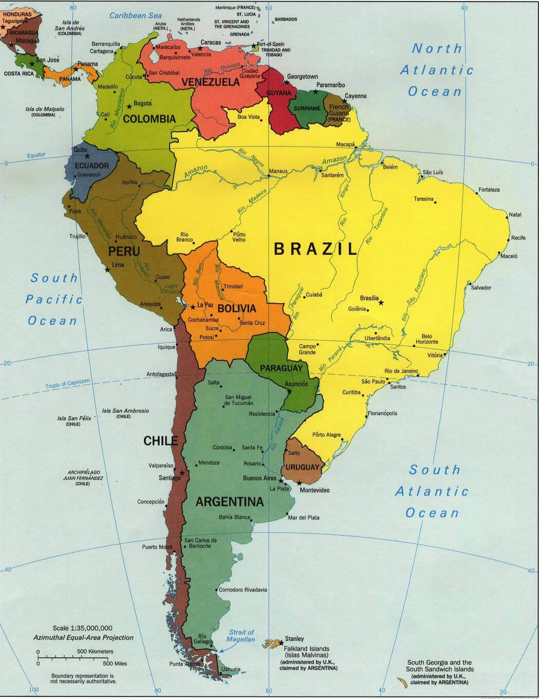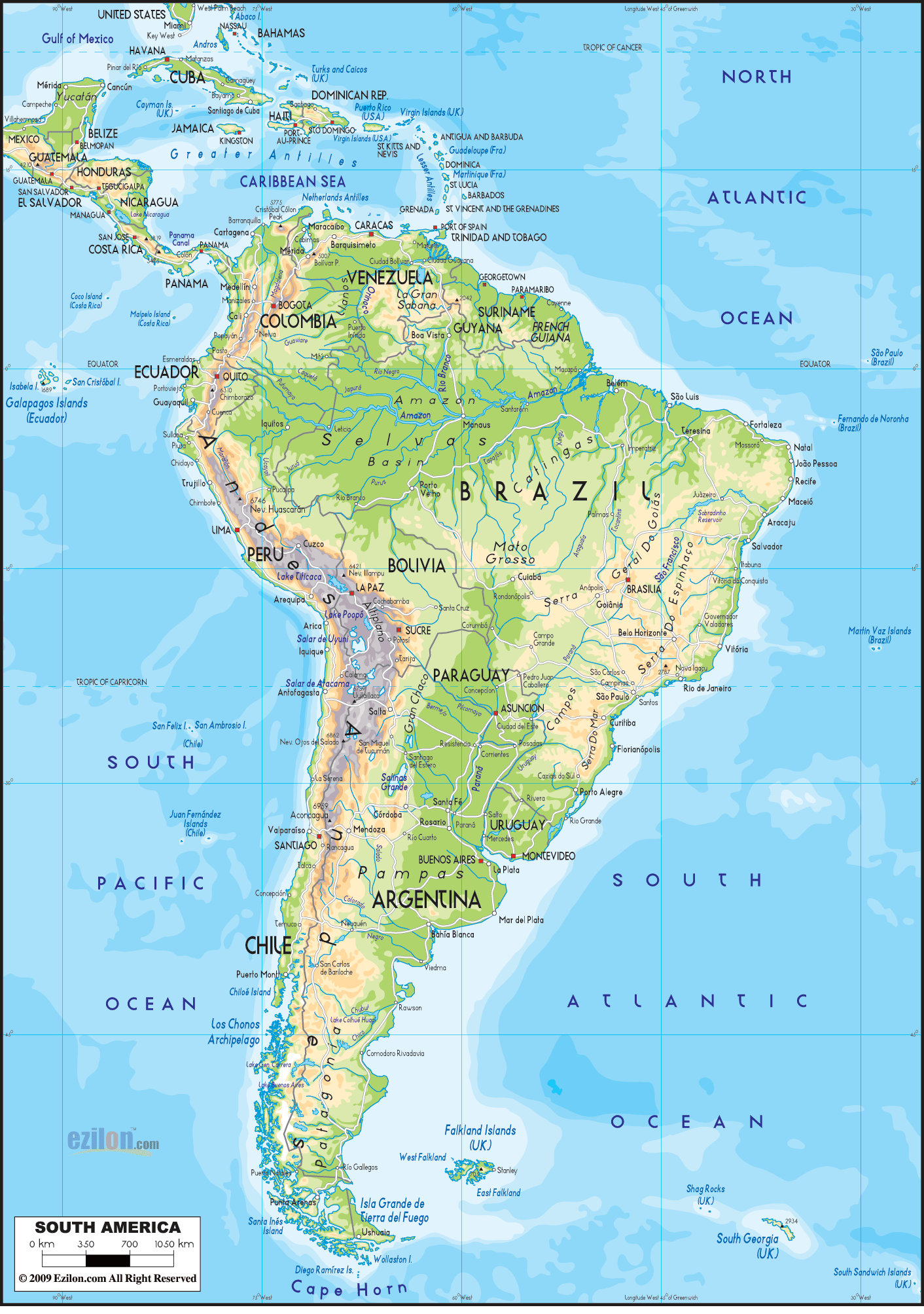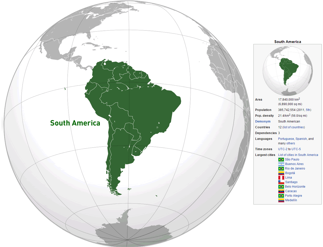 South America is a continent in the western hemisphere, specifically the southern half of the Americas. It is bordered by the Caribbean Sea to the northwest, North America to the north, the Pacific Ocean to the west, and the Atlantic Ocean to the east. The countries and territories of South America include Argentina, Bolivia, Brazil, Chile, Colombia, Ecuador, Paraguay, Peru, Uruguay, and Venezuela.