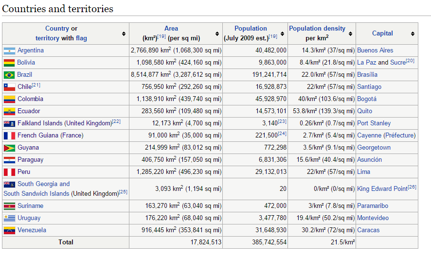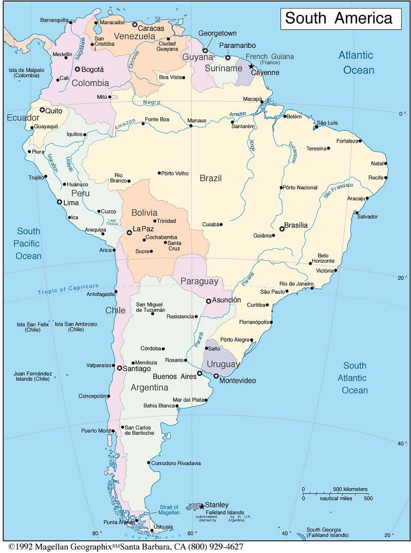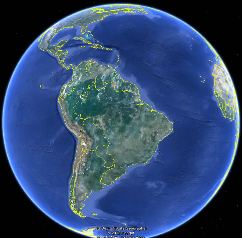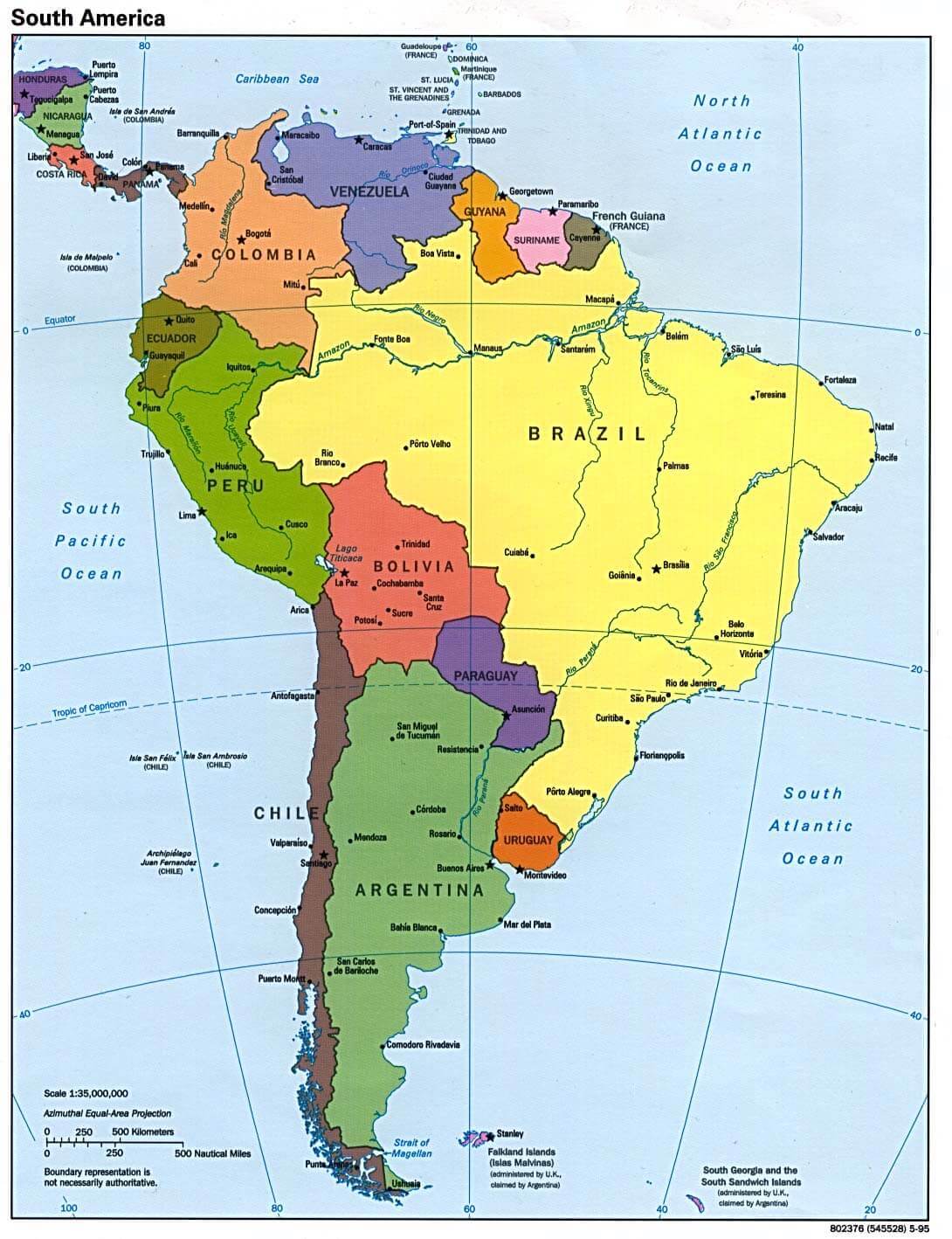 South America is a continent in the western hemisphere, specifically the southern half of the Americas. It is bordered by the Caribbean Sea to the northwest, North America to the north, the Pacific Ocean to the west, and the Atlantic Ocean to the east. The countries and territories of South America include Argentina, Bolivia, Brazil, Chile, Colombia, Ecuador, Paraguay, Peru, Uruguay, and Venezuela.