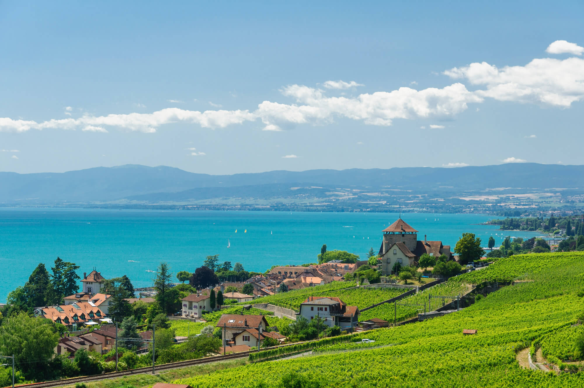 The Lavaux Vineyard Terraces UNESCO World Heritage Site near Lausanne, Switzerland along Lake Geneva.