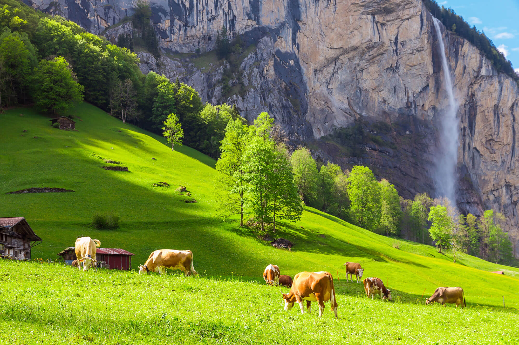 Summer landscape with cow grazing on fresh green mountain pastures. Lauterbrunnen, Switzerland, Europe.