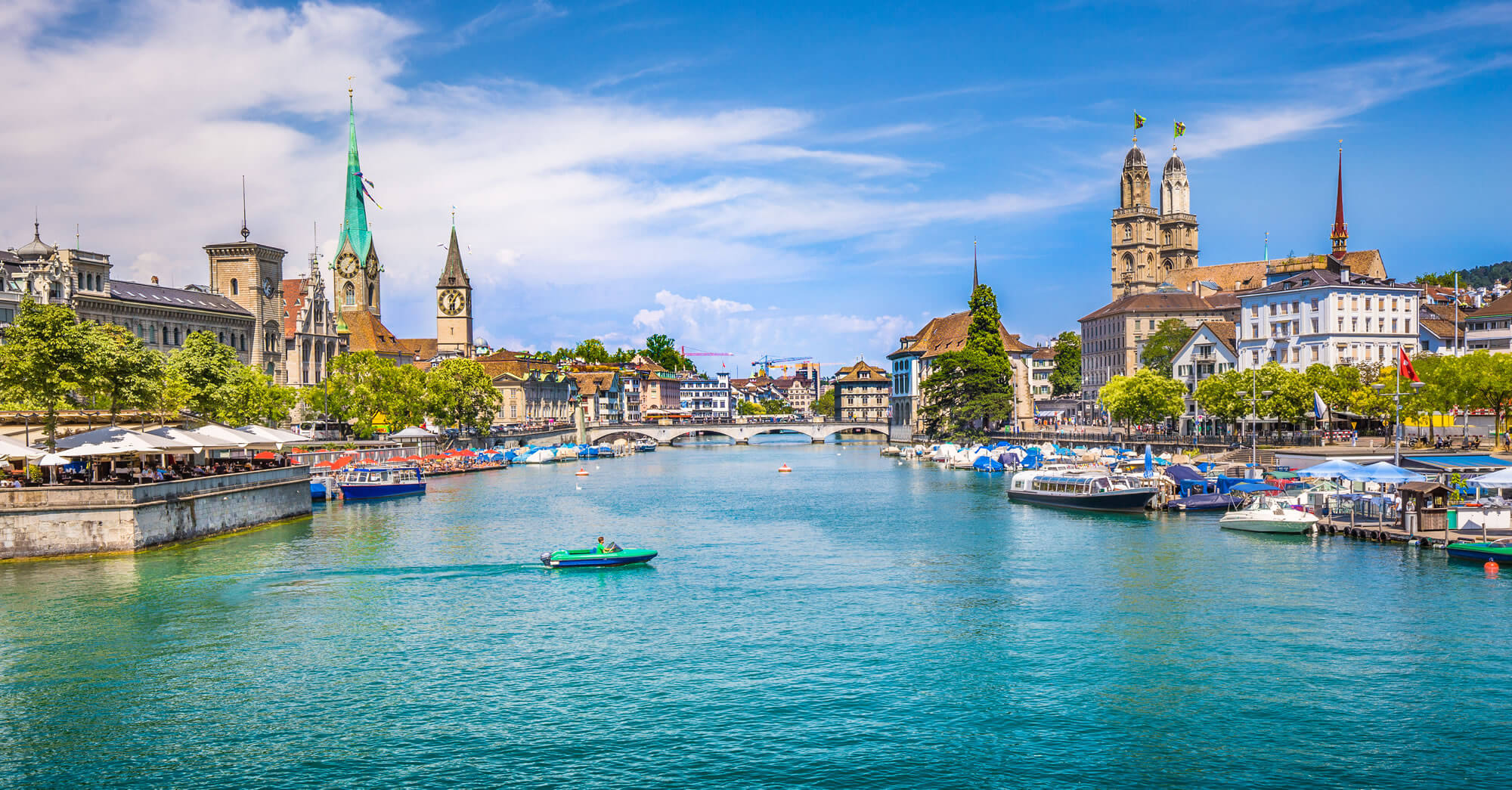 Panoramic view of historic Zurich city center with famous Fraumunster, Grossmunster and St. Peter and river Limmat at Lake Zurich on a sunny day with clouds in summer, Canton of Zurich, Switzerland.